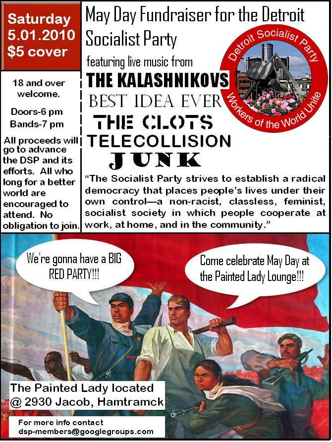 6PM – 12AM: Detroit Socialist Party Benefit Show Featuring musical performances by The Kalashnikovs, Best Idea Ever, The Clots, Telecollision, and Junk– at the Painted Lady Lounge, 2930 Jacob St. Hamtramck, MI 48212 (map). $5 cover (goes to support the Detroit Socialist Party). (18+ age-limit due to bar location).